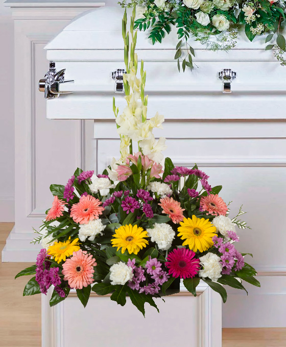 Nuestra Centro Funerario Clavel y Gerberas, está compuesto por gladiolos, gerberas de color, margaritas, alstroemerias, clavel y elegantes verdes. El centro funerario diseñado con flores para tanatorio en varios colores. El color del centro funerario para tanatorio se puede cambiar a gusto del cliente y efectuarlo en la tonalidad que se desee.