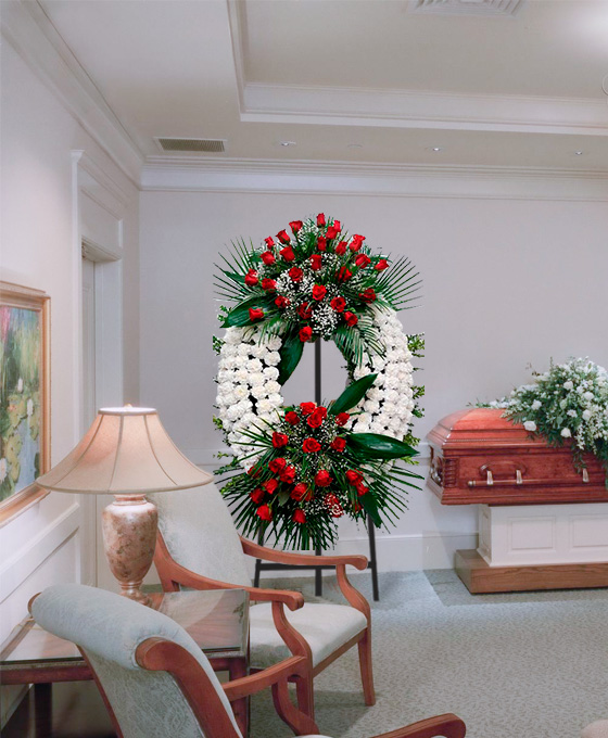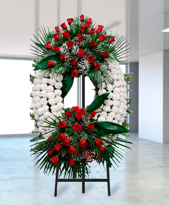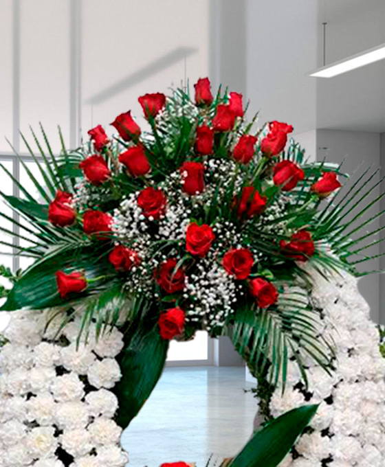 Bonita y fina Corona de Condolencia Funeraria Doble Cabezal. Confeccionada en un aro de claveles blancos y decorada con dos cabezales con rosas, paniculata y hermosas hojas tropicales que le dan un aire todavía más elegante. Se hacen entregas urgentes de flores para tanatorios en todos los tanatorios.