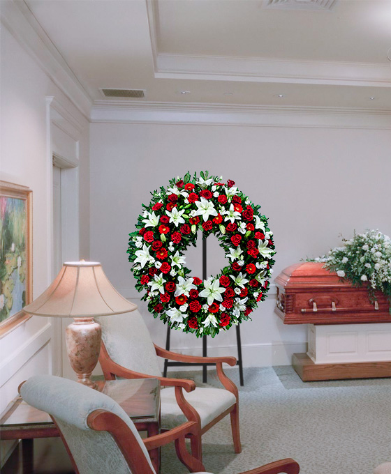 Corona Funeraria Flor Variada, decorada con flores; lilium, gerberas, anastasias, margaritas, rosas, toda ella decorada con elegantes verdes variados. Esta Corona Funeraria, de flores para entierro, es una corona elegante y con mucho diseño que sigue una línea de coronas funerarias para Tanatorio. Es una corona especialmente bonita para su envío de flores al tanatorio. Esta delicada Corona para Difuntos está disponible en tonos blancos, rosas y rojos.