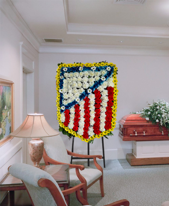 Esta Centro Funerario Atlético de Madrid, de Flores para difuntos, está confeccionada por margaritas y claveles en los colores del Club Atlético de Madrid. Es un Centro fúnebre para Tanatorio muy especial para alguien aficionado al equipo. Este Producto del Atlético de Madrid es ideal para un aficionado colchonero. El centro de Flores Difuntos acompañara a la familia en estos momentos tan especiales.