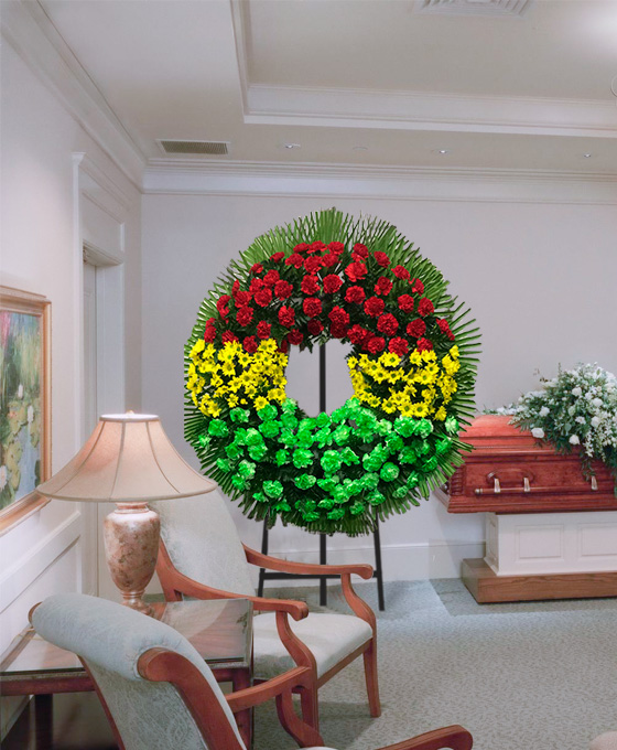 Nuestra Corona Bandera Personalizada, de Floristería Tanatorio Madrid es una composición floral especial, ya que podemos hacer la corona con los colores del país que tu quieras. En Floristería Tanatorio Madrid siempre elaboramos las coronas funerarias para difuntos con flores fúnebres de gran calidad; nuestras flores son siempre frescas y están suministradas por proveedores nacionales e internacionales. Es por ello que nuestra Corona funeraria para defunción es un gran trabajo floral funerario e incluye flores blancas para expresar condolencias que acompañan el sentimiento de la familia del difunto. Además, somos especialistas en el arte floral funerario y en el envío de flores funerarias a tanatorios de Madrid.