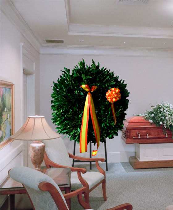 Preciosa Corona de Laurel realizada con las mejores flores para tanatorio. Esta Corona de Laurel decorada con cintas funerarias con la bandera de España, es el producto perfecto para expresar nuestras condolencias mas sinceras y cercanas a la familia del difunto. Nuestras flores son siempre frescas y están suministradas a diario. Esta Corona Funeraria, está realizada siempre con flores para tanatorio de Madrid de la máxima calidad. Somos floristas profesionales en el sector, dedicados prácticamente en exclusiva al Arte Floral Funerario.